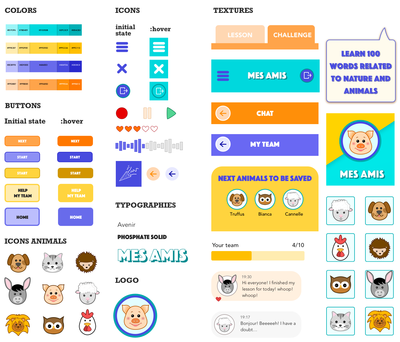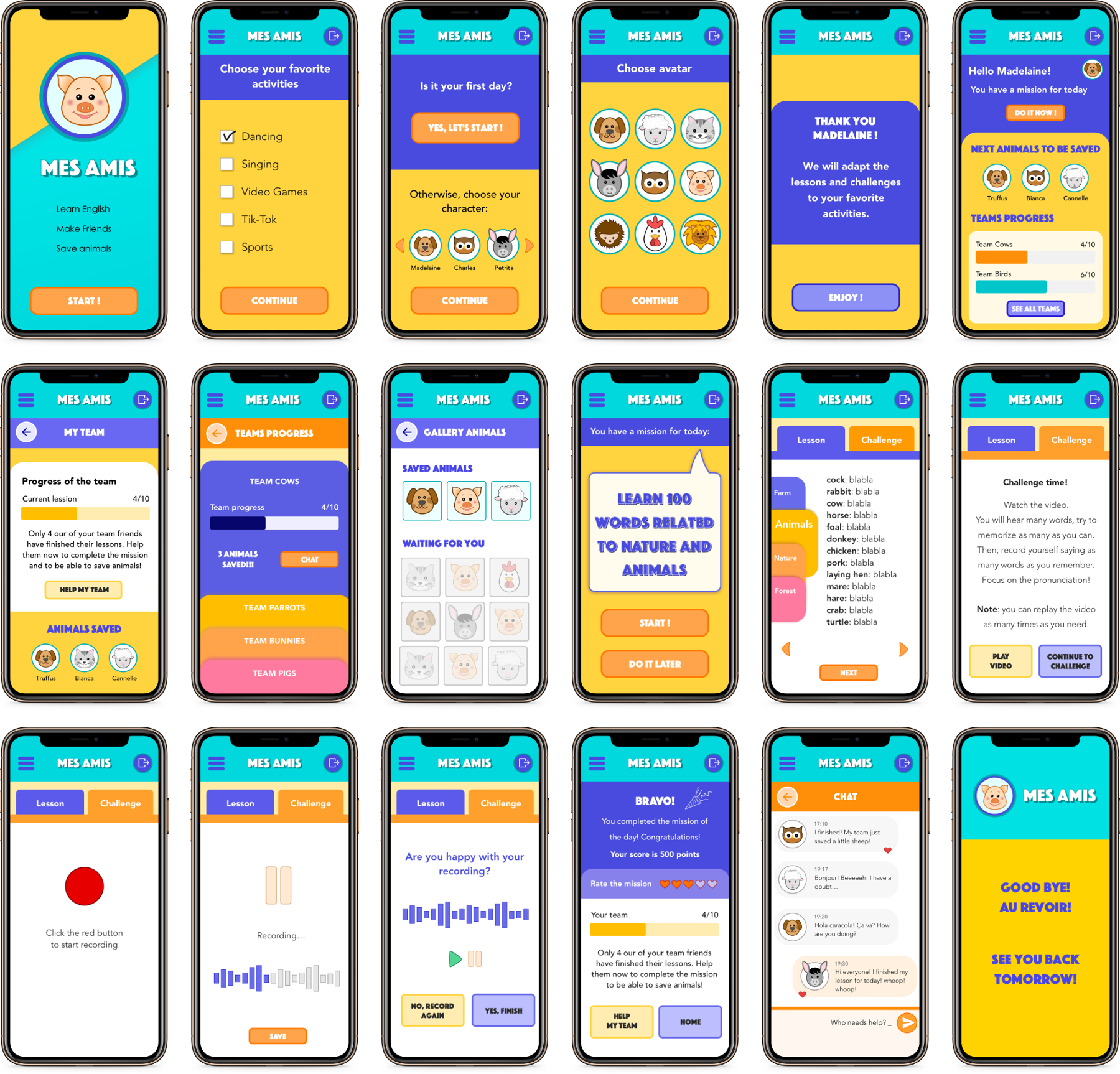 The project Mes Amis ('my friends' in French) started with just an idea and a blank paper: "Design of an app for children to learn a new language while having fun." After a UX research, interviews, and user and market research, these are the high fidelity design screens for the mobile app for kids.